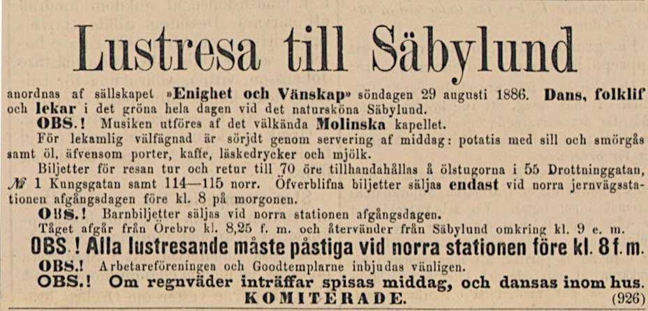 Det är troligt att hållplatsen öppnades redan den 24 juli 1886, oaktat att det finns andra uppgifter. T.ex. en anteckning till Järnvägsmuseets bild, JvmKBEA01054 nämner att Säbylund upprättades 1887. Den uppgiften måste vara felaktig, då flera tidningsnotiser, redan sommaren 1866 berättar om öppnandet! Utöver det finns samma år annonser om extratåg för “Lustresa till Säbylund” i Nerikes Allehanda fredagen den 27 augusti och i Nerikesposten lördagen den 28 augusti. Med “norra stationen” avses Köping-Hult banans station i Örebro! Mer info i avsnittet “Hållplatsen.”
