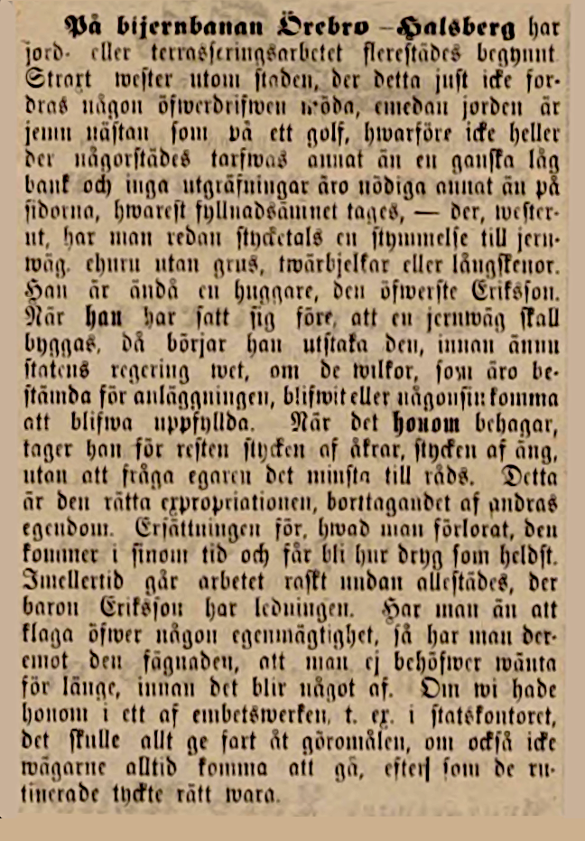 Samma år hade 1853-54 års riksdag beslutat att staten i första hand borde bygga linjerna Stockholm–Göteborg, norr om Mälaren via Örebro, Stockholm–Malmö, Stockholm–Uppsala–Gävle och en linje till Kristiania. Ericson var emot att dra stambanan norr om Mälaren och lyckades ändra på det beslutet när byggnationerna senare startades.